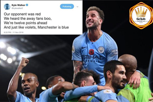 ไคล์ วอล์คเกอร์ แบ็คตัวแสบของ แมนเชสเตอร์ ซิตี้ แต่งกลอนล้อผีแดง แมนเชสเตอร์ ยูไนเต็ด โพสต์ลงทวิตเตอร์ หลังจากช่วยทีมคว้าชัยในเกมดาร์บี้เมื่อคืนวันอาทิตย์ที่ผ่านมา ซึ่งเกมพรีเมียร์ลีกที่สนามเอติฮัด "เรือใบสีฟ้า"ออกนำก่อน 2-0 จาก ดาบิด ซิลบา และ แซร์กิโอ อเกวโร่ ก่อนที่"ปีศาจแดง"จะตีไข่จากจุดโทษของ อองโตนี่ มาร์กซิยาล ช่วงกลางครึ่งหลัง