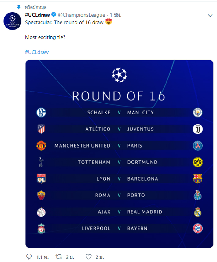 วันนี้ทีมข่าว Gclub จีคลับ เกมสล็อตออนไลน์ สล็อตมือถือ รายงานผลการจับฉลากยูฟ่า แชมเปี้ยนส์ ลีกรอบ 16 ทีมสุดท้ายมีบิ๊กแมตช์เมื่อ"ม้าลาย"ยูเวนตุสจับฉลากมาเจอกับ"ตราหมี"แอตเลติโก มาดริด ส่วน"ปีศาจแดง"แมนเชสเตอร์ ยูไนเต็ดเจอของแข็งอย่าง"เปแอสเช"ปารีส แซงต์-แชร์กแมง ด้าน"หงส์แดง"ลิเวอร์พูลงานหนักฟัด"เสือใต้"บาเยิร์น มิวนิค สมัครสมาชิก Gclub ได้ที่ ID Line@: @sbg555 (มี@นำหน้าด้วยนะคะ) บริการฟรี 24 ชั่วโมง (Gclub)