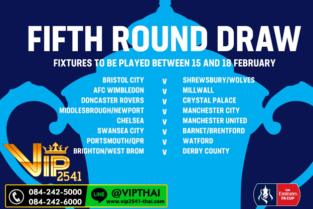 วันนี้ทีมข่าว VIP2541 รายงานผลการจับสลาก เอฟเอ คัพ อังกฤษ รอบ 5 หรือรอบ 16 ทีมสุดท้าย ประกบคู่ออกมาแล้วเมื่อคืนวันจันทร์ที่ 28 มกราคม ที่ผ่านมา สมัครสมาชิกวีไอพี2541 ได้ที่ ID Line@: @vipthai (มี@นำหน้าด้วยนะคะ) บริการฟรี 24 ชั่วโมง
