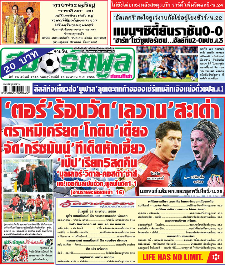 ตัวอย่าง นสพ. สปอร์ตพูล ฉบับวันที่ 28 เม.ย. 2559