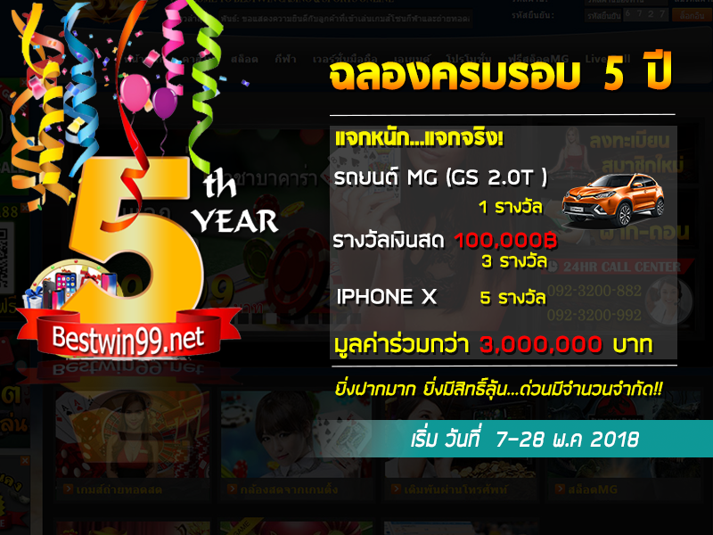 Bestwin99.netฉลองครบรอบ5ปีแจกเงินสดและของรางวัลมากมาย ด่วนๆ ของรางวัลมีจำนวนจำกัด