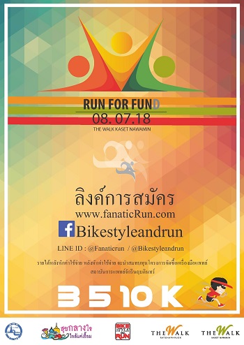 Bike STYLE and Run ร่วมกับ การท่องเที่ยวแห่งประเทศไทย และ ศูนย์การค้าเดอะวอล์ค เกษตรนวมินทร์ เชิญนักวิ่งและผู้รักสุขภาพ มาร่วมวิ่งสนุกเพื่อสุขภาพ 'RUN FOR FUND' วันอาทิตย์ที่ 8 กรกฎาคม 2561 งานวิ่งที่คุณจะได้ทั้งความสนุกและการกุศล ร่วมเติมสีสันในเช้าวันอาทิตย์ของกรุงเทพฯ สนุกกับการออกกำลังกายยามเช้าด้วยการวิ่งไปพร้อมกัน และร่วมแบ่งปันน้ำใจให้สังคม โดยเงินรายได้ส่วนหนึ่งหลังหักค่าใช้จ่าย จะนำสมทบทุนโครงการจัดซื้อเครื่องมือแพทย์ สถาบันการแพทย์จักรีนฤบดินทร์ ซึ่งเป็นสถาบันการแพทย์ต้นแบบที่ครบวงจรสำหรับคนไทยทุกคน