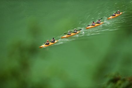 ผู้เข้าแข่งขันต้องไต่เชือกจากสะพานสูง 200 เมตรลงสู่แม่น้ำอู่เจียง ต่อด้วยพายเรือแคนูระยะทาง 25 กิโลเมตร จากนั้นขึ้นบกและขี่จักรยานไปตามภูเขาไป๋หม่าอันแสนงดงามด้วยระยะทางกว่า 60 กิโลเมตร ปิดท้ายด้วยการวิ่งครอสคันทรี่ 10 กิโลเมตร